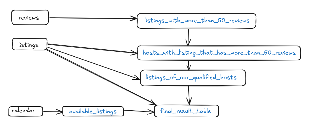 As the image shows, we have two main data flows. One that starts from the reviews and then the listings are joined into it several times. The second flow starts from the calendar and joins into the final results. These two flows are combined in the final_result_table CTE. It is perfectly doable using CTEs but the flow is a bit clumsy. Joining the two flows works perfectly when using CTEs.